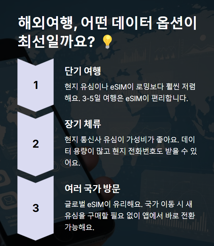 그렇다면, 유심(SIM)과 eSIM 중 어떤 걸 선택해야 할까요? 🤔 여행 스타일, 방문 국가, 스마트폰 기종에 따라 더 적합한 옵션이 달라져요! ✅ 지금부터 각 상황별로 어떤 선택이 좋은지 알려드릴게요! 📲
