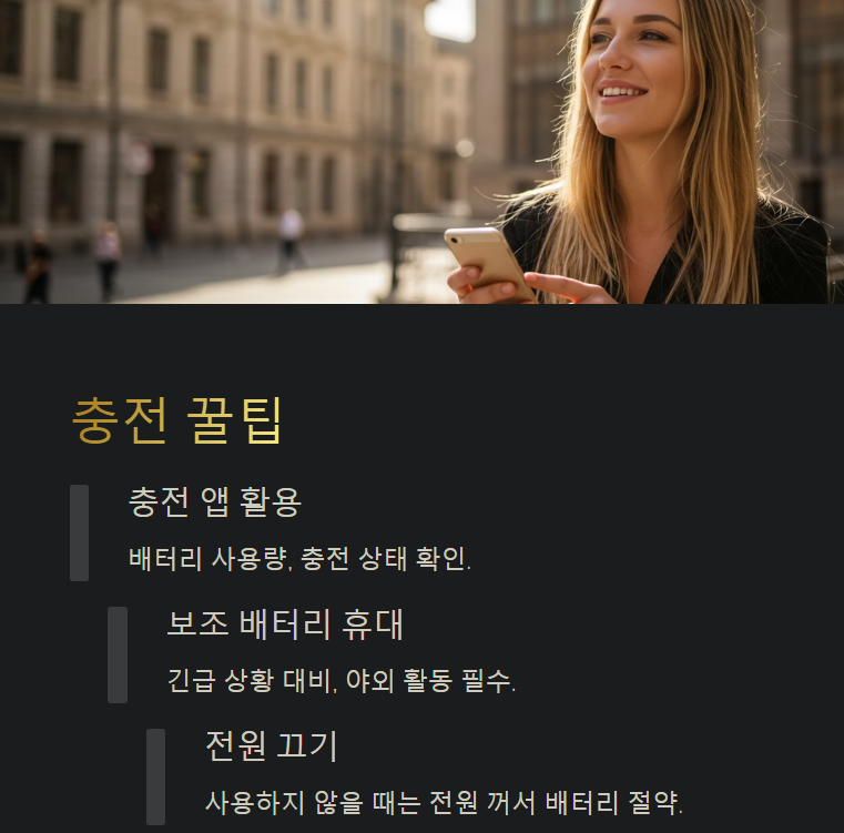 - ✅ 보조배터리 챙기기 → 외출 중 충전이 어려울 경우 필수!