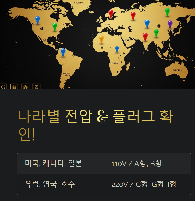 - ⚡ 국가마다 전압(Volt)이 다름 → 한국(220V) vs 일본(100V) vs 미국(110V)