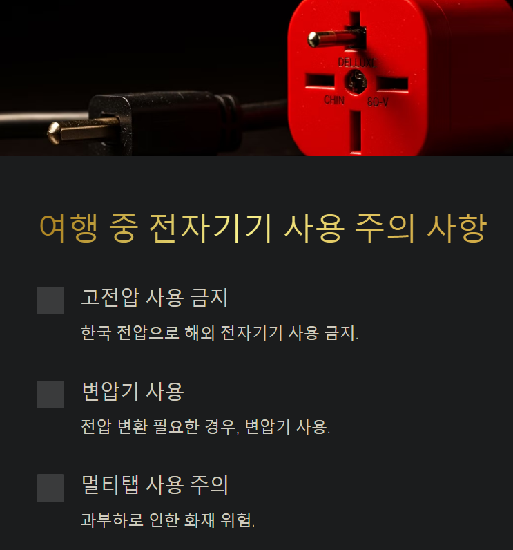 - 💥 전압 차이로 전자기기 고장 위험! → 어댑터 없이 바로 꽂으면 기기가 망가질 수도 있음