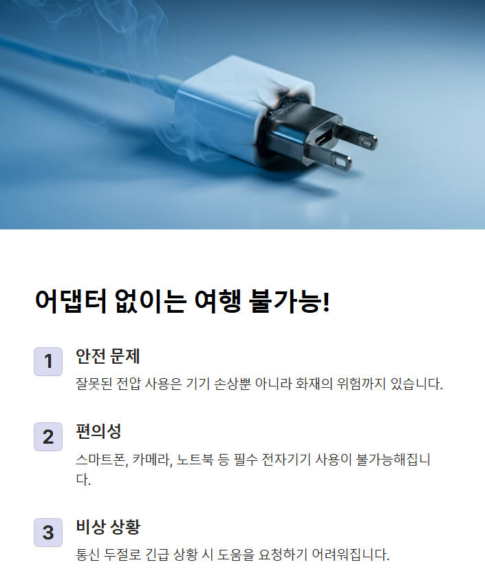 - 💥 전압 차이로 전자기기 고장 위험! → 어댑터 없이 바로 꽂으면 기기가 망가질 수도 있음