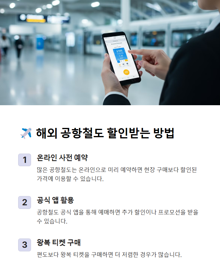 "해외 공항에서 시내까지 교통비가 너무 비싸요!" 😩 하지만 할인받는 방법을 알면 최대 50%까지 절약할 수 있어요! ✅ 공항철도, 대중교통 패스, 현지 교통카드 할인 정보를 총정리해드립니다! 🚆🚌
