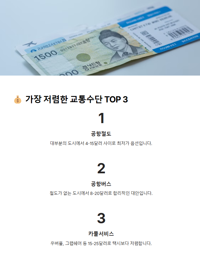 "최대한 저렴하게 공항에서 시내까지 가고 싶어요!" 💰 그렇다면 이동 수단 TOP 3를 추천해 드릴게요! ✅