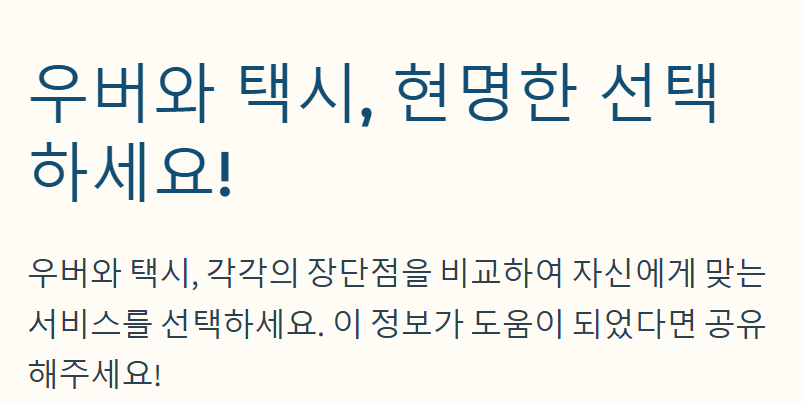 - ✔ 심야시간은 요금 비교 필수! - 우버는 피크타임 할증, 택시는 야간 할증이 적용될 수 있음