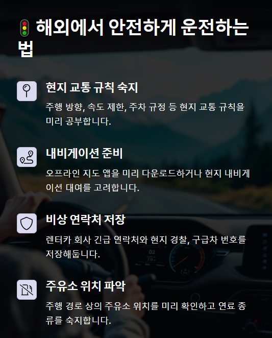 - ✅ 국제운전면허증 발급 필수! (미국 일부 지역 제외)