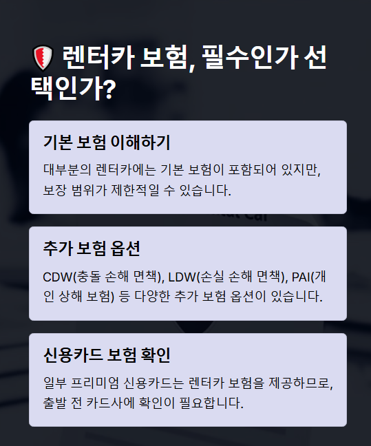 - ✅ 추가 팁: 신용카드 혜택에 렌터카 보험 포함된 경우도 있음! 확인 필수!