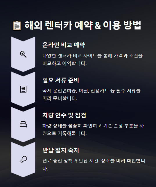 "해외에서 렌터카 예약하는 게 복잡할까요?" 🤔 아니요! 미리 준비하면 쉽고 저렴하게 렌터카를 이용할 수 있어요. 🚗 예약부터 반납까지 렌터카 이용 완벽 가이드를 알려드릴게요! ✅