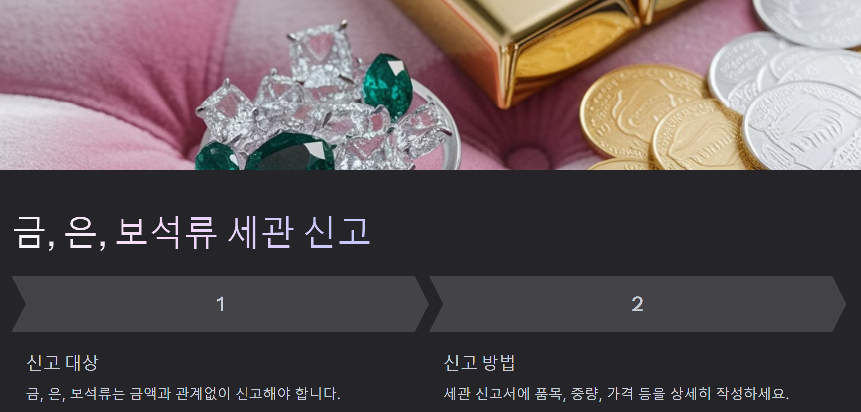반입 가능한 금, 은, 보석류의 가격이 $800을 초과하면 면세 범위를 초과하므로 반드시 신고해야 해요. 특히 순금 제품은 세관에서 정밀 검사를 받을 수도 있어요.