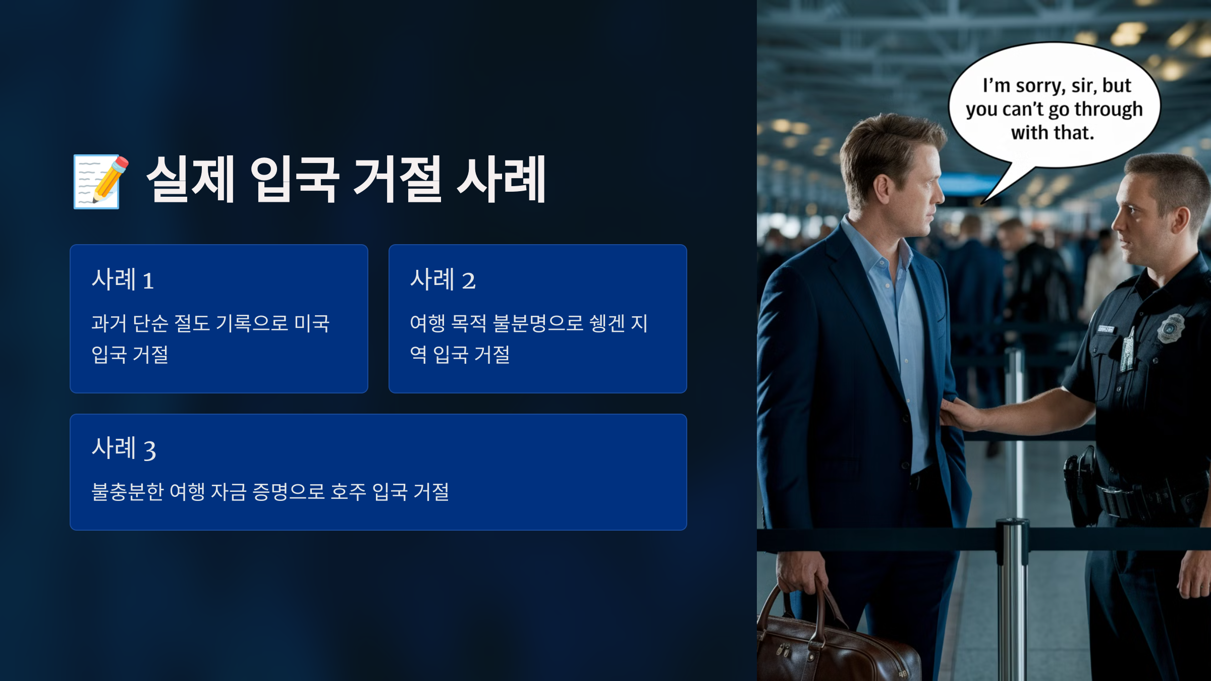 실제로 한국인 여행자들도 **비자 문제, 서류 미비, 과거 기록, 심사관의 판단** 등 다양한 이유로 입국이 거절되는 경우가 많아요. **하지만 미리 준비하면 충분히 피할 수 있어요!** ✈️