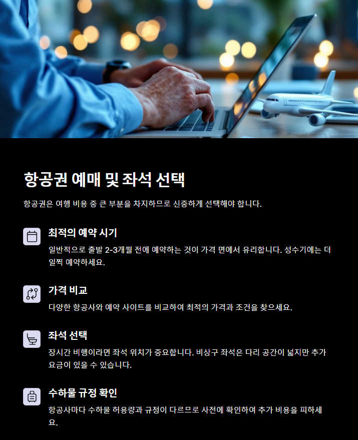 항공권을 예매할 때는 가격뿐만 아니라 경유 여부, 수하물 포함 여부, 출발 시간도 함께 고려해야 해요. 저가 항공사의 경우 위탁 수하물이 포함되지 않는 경우가 많으니 주의하세요!