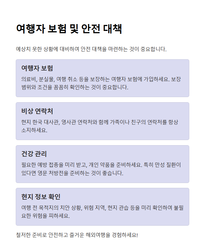 해외여행에서는 준비만 잘해도 위험을 줄일 수 있어요. 나와 가족의 안전을 위해 꼭 여행자 보험에 가입하고, 신중하게 여행 계획을 세워보세요! 😊